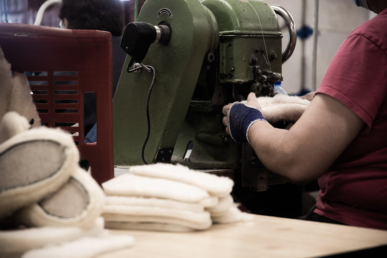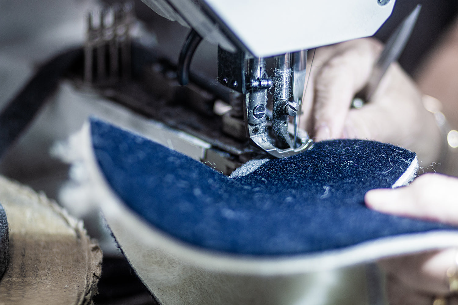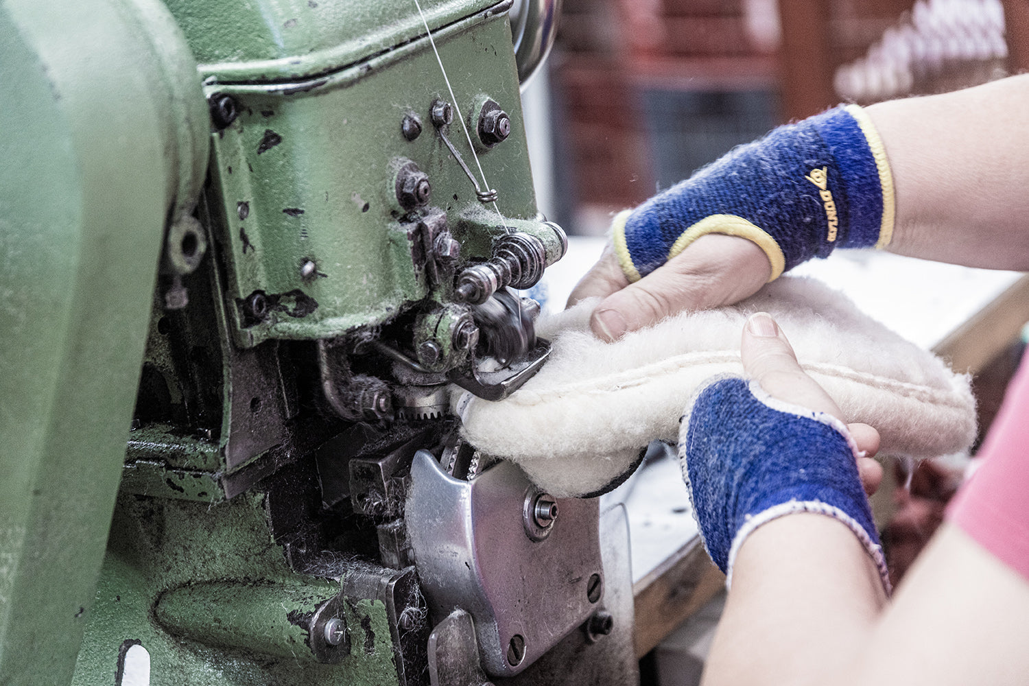 Les traditionnelles charentaises sont fabriquées selon la méthode du cousu retourné. Pour commencer, le tissu et la laine sont contrecollés pour créer cette matière particulière qui contribue à rendre ce chausson unique. Ensuite vient la découpe de la tige, la partie supérieure de la chaussure, où les emporte-pièces métalliques se glissent sous la grosse presse. Puis la tige, qui vient d’être découpée, est retournée sur l’envers et ses deux extrémités arrière sont cousues entre elle : c’est le jointage. Pour renforcer cette couture située au talon, un galon est cousu sur cette partie arrière. Ensuite un biais, souvent un liseré en coton, est cousu tout autour de la partie supérieure de la charentaise. Vient ensuite la couture de la fameuse semelle extérieure en feutre. Elle peut être enduite pour rendre la pantoufle plus durable et résistante à l’humidité. Ensuite, la semelle intérieure, aussi appelée la douillette parce que composée d’une laine moelleuse, est cousue à la tige. Toutes ces étapes ayant été réalisées sur l’envers du chausson, la charentaise est enfin prête pour son étape finale : le retourné !
