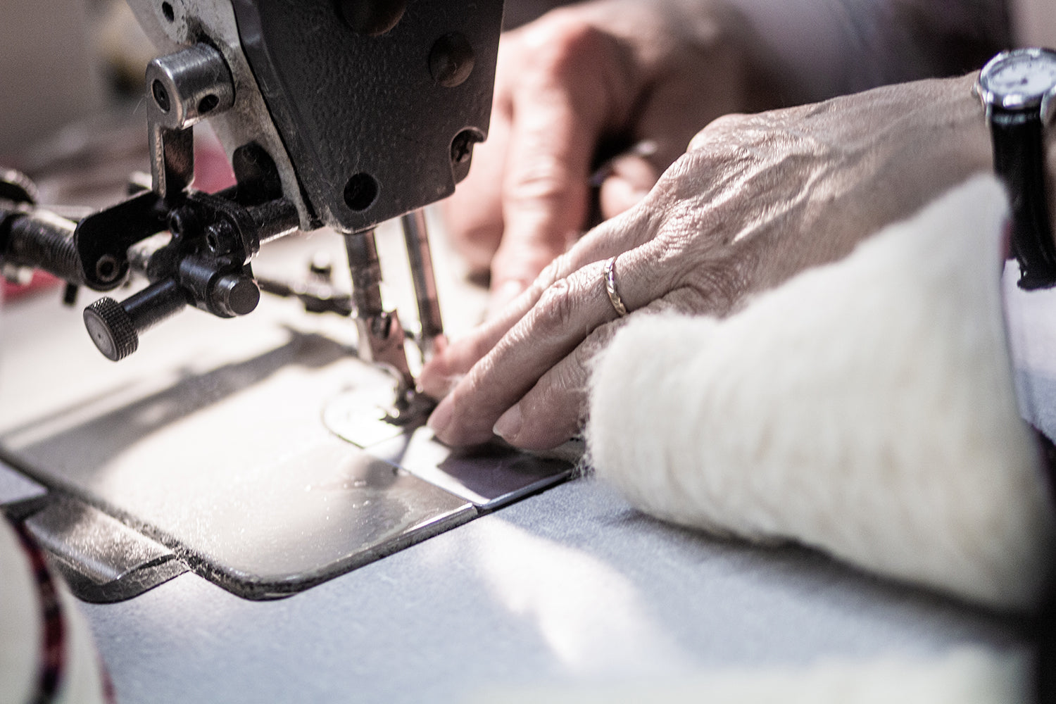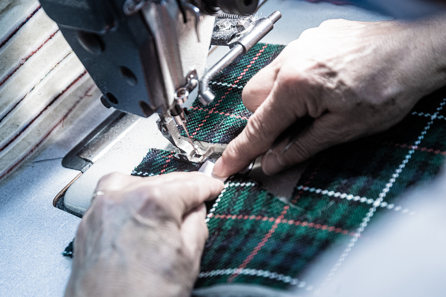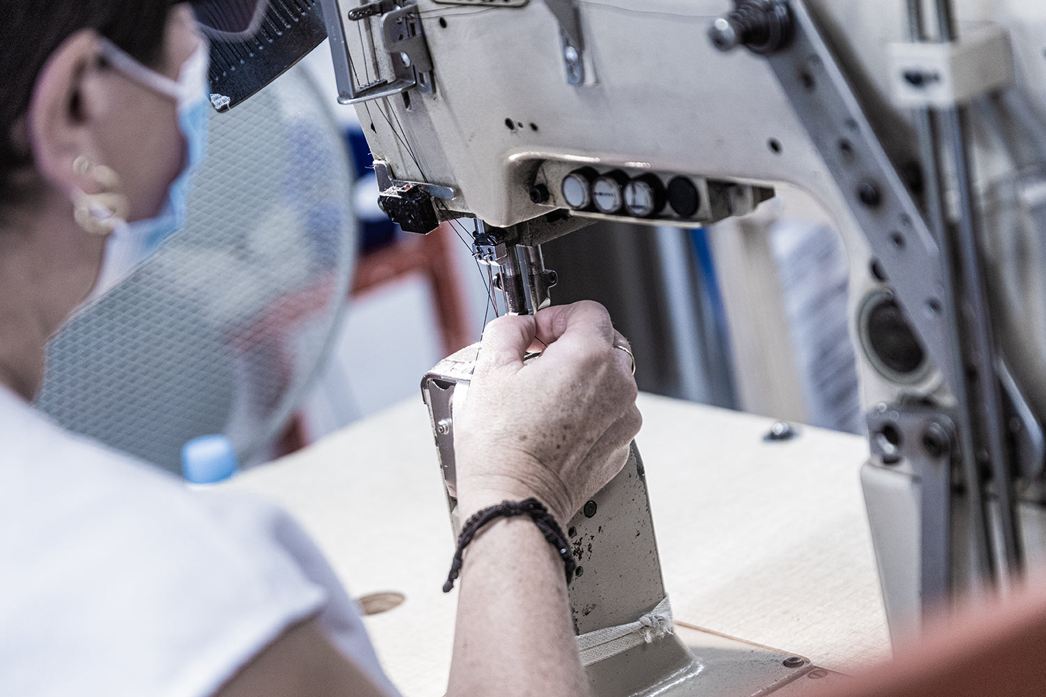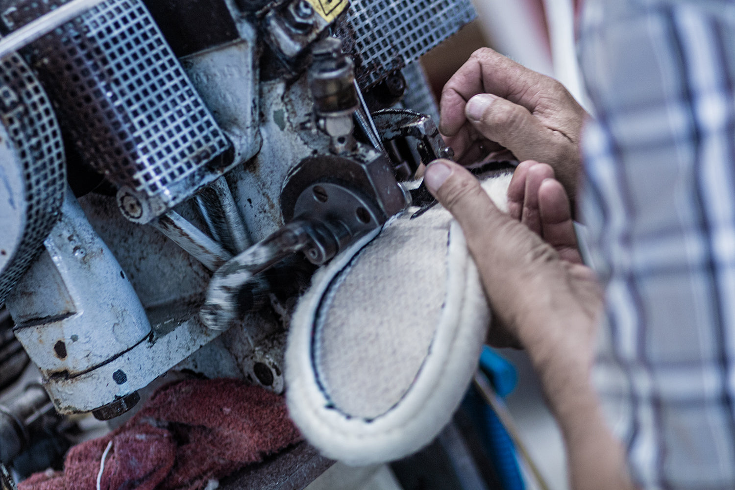 Les traditionnelles charentaises sont fabriquées selon la méthode du cousu retourné. Pour commencer, le tissu et la laine sont contrecollés pour créer cette matière particulière qui contribue à rendre ce chausson unique. Ensuite vient la découpe de la tige, la partie supérieure de la chaussure, où les emporte-pièces métalliques se glissent sous la grosse presse. Puis la tige, qui vient d’être découpée, est retournée sur l’envers et ses deux extrémités arrière sont cousues entre elle : c’est le jointage. Pour renforcer cette couture située au talon, un galon est cousu sur cette partie arrière. Ensuite un biais, souvent un liseré en coton, est cousu tout autour de la partie supérieure de la charentaise. Vient ensuite la couture de la fameuse semelle extérieure en feutre. Elle peut être enduite pour rendre la pantoufle plus durable et résistante à l’humidité. Ensuite, la semelle intérieure, aussi appelée la douillette parce que composée d’une laine moelleuse, est cousue à la tige. Toutes ces étapes ayant été réalisées sur l’envers du chausson, la charentaise est enfin prête pour son étape finale : le retourné !