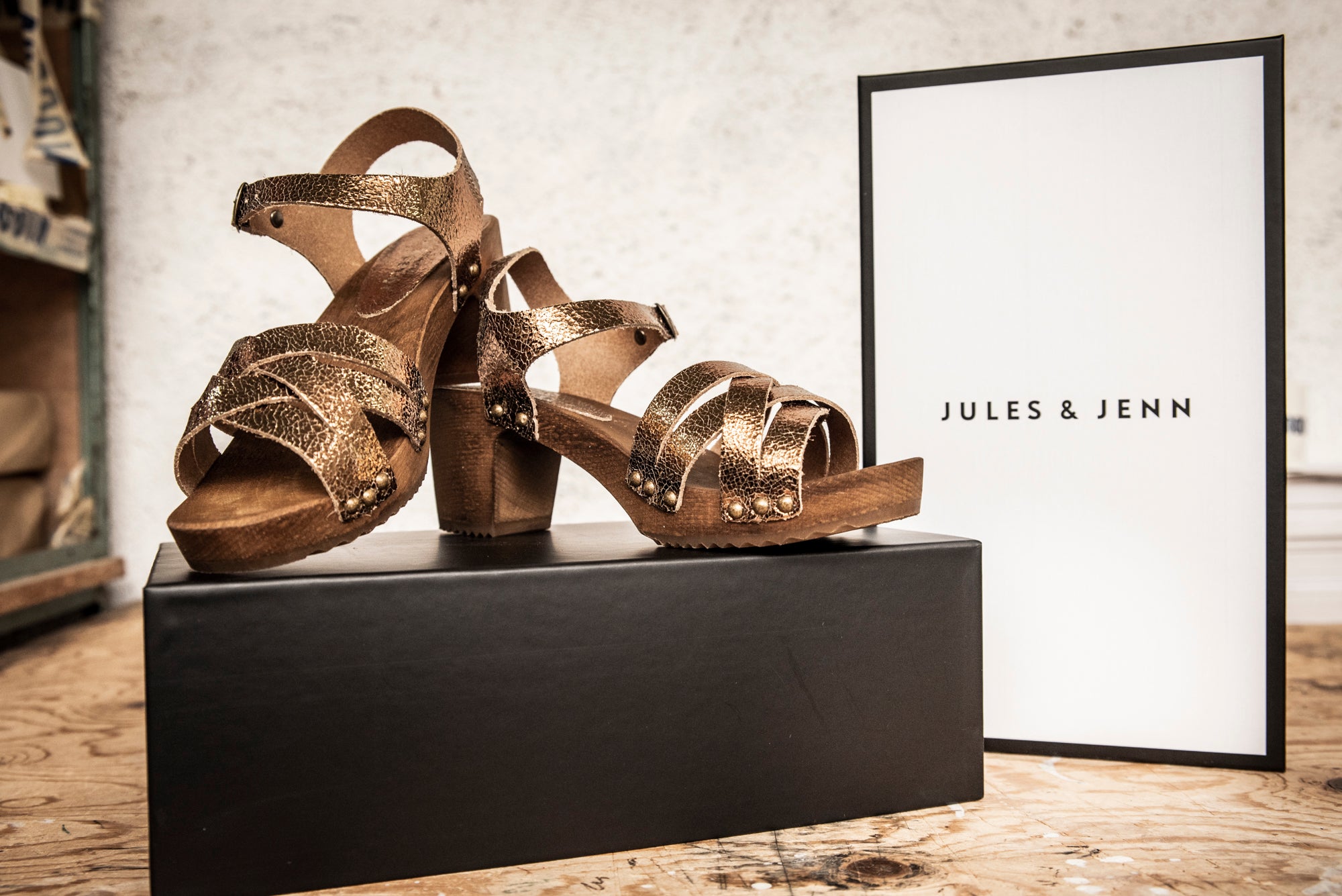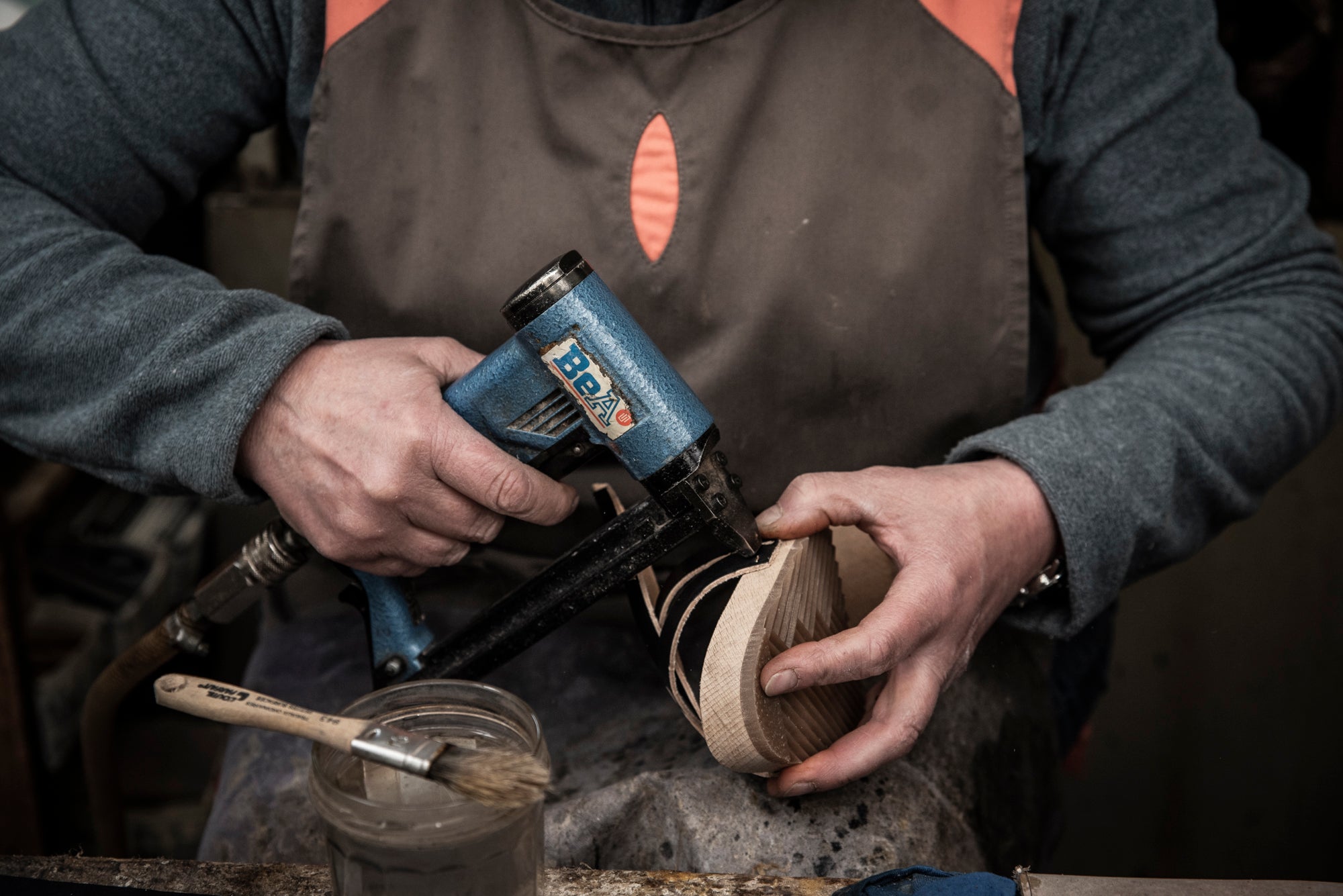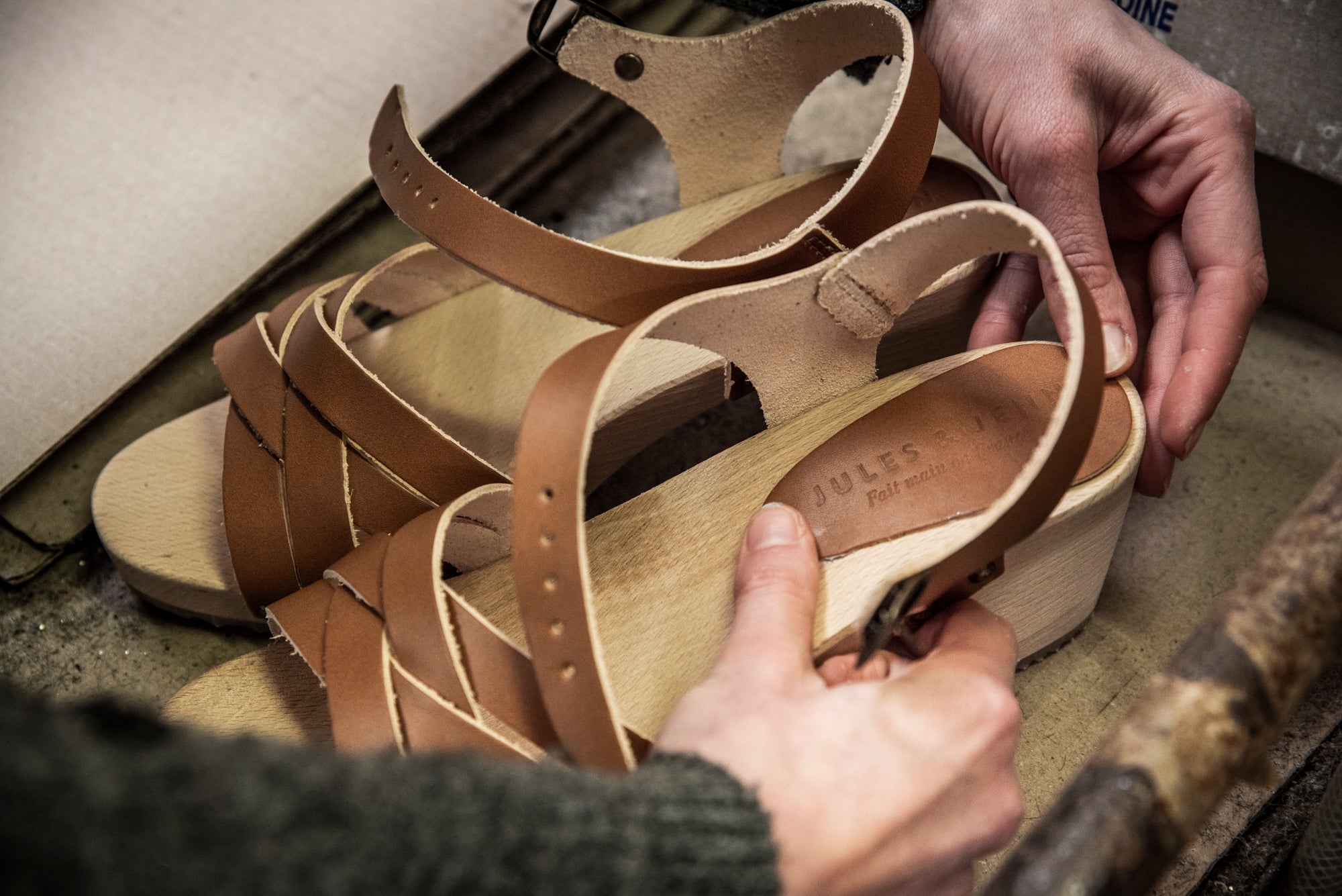 Sur la base du dessin, le modéliste réalise le patronnage des différentes parties qui vont composer la chaussure. Grâce à des emporte-pièces, le coupeur découpe, manuellement ou à l’aide d’une presse, les différentes parties du modèle dans la matière choisie. Les pièces composant la tige – le dessus de la chaussure – doivent être soigneusement coupées pour éviter les défauts naturels du cuir. Ces pièces sont ensuite cousues entre elles pour former la tige qui est ensuite posée sur un moule, variant selon la pointure, afin d’être fixée à la semelle interne. Selon le modèle, les opérations de couture, collage, ponçage et séchage se succèdent. En parallèle, la semelle en bois est fabriquée sur place dans l’atelier. Pour se faire, le coupeur vient façonner la semelle dans des blocs de bois de hêtre. Elle est ensuite poncée pour retirer les excédents de matière. Enfin, la semelle extérieure est fixée, par couture et collage. Des rivets décoratifs sont enfin ajoutés manuellement. Après un temps de séchage, le montage de la chaussure est terminé. Le moule est alors retiré de la chaussure. Enfin, la chaussure est bichonnée afin d’assurer une finition impeccable. Enrobée de papier de soie, la chaussure est délicatement posée dans sa boîte JULES & JENN. Il ne reste plus qu’à y glisser vos pieds.