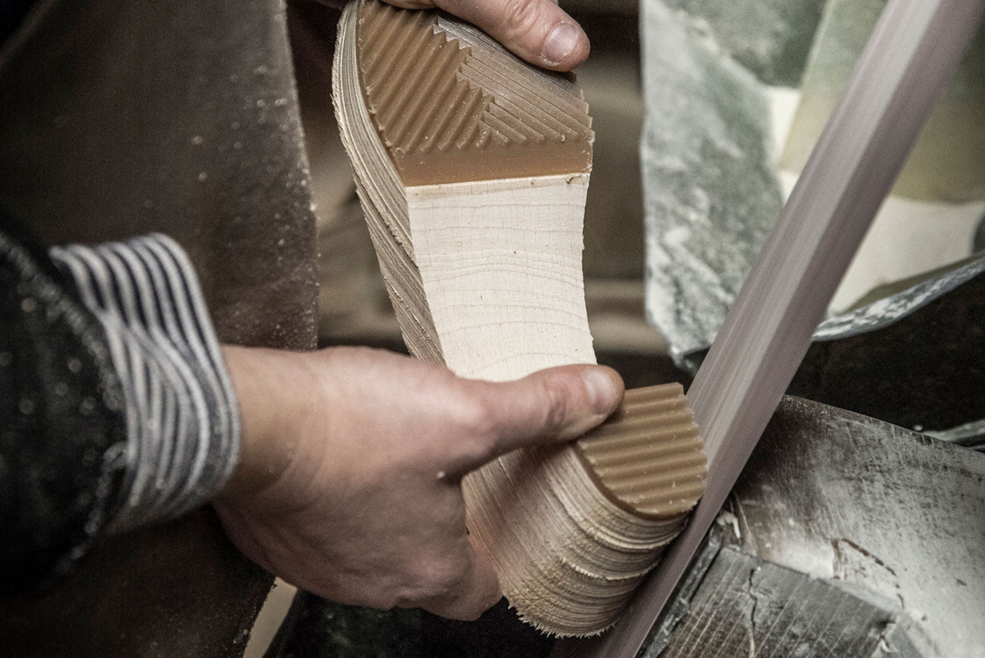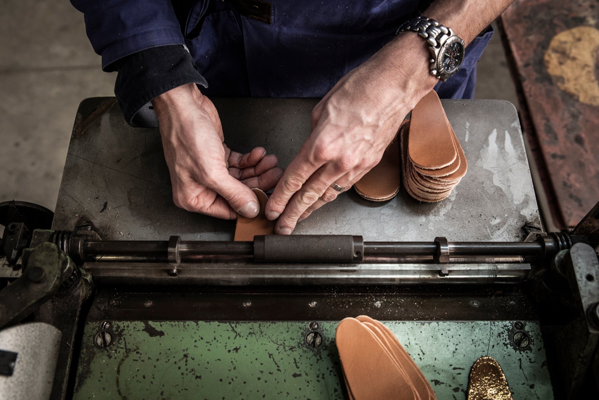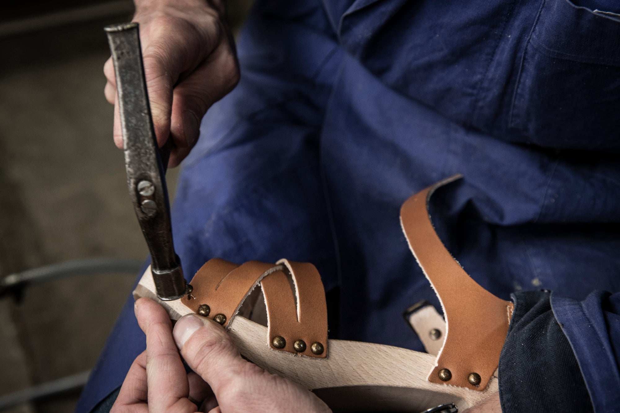 Sur la base du dessin, le modéliste réalise le patronnage des différentes parties qui vont composer la chaussure. Grâce à des emporte-pièces, le coupeur découpe, manuellement ou à l’aide d’une presse, les différentes parties du modèle dans la matière choisie. Les pièces composant la tige – le dessus de la chaussure – doivent être soigneusement coupées pour éviter les défauts naturels du cuir. Ces pièces sont ensuite cousues entre elles pour former la tige qui est ensuite posée sur un moule, variant selon la pointure, afin d’être fixée à la semelle interne. Selon le modèle, les opérations de couture, collage, ponçage et séchage se succèdent. En parallèle, la semelle en bois est fabriquée sur place dans l’atelier. Pour se faire, le coupeur vient façonner la semelle dans des blocs de bois de hêtre. Elle est ensuite poncée pour retirer les excédents de matière. Enfin, la semelle extérieure est fixée, par couture et collage. Des rivets décoratifs sont enfin ajoutés manuellement. Après un temps de séchage, le montage de la chaussure est terminé. Le moule est alors retiré de la chaussure. Enfin, la chaussure est bichonnée afin d’assurer une finition impeccable. Enrobée de papier de soie, la chaussure est délicatement posée dans sa boîte JULES & JENN. Il ne reste plus qu’à y glisser vos pieds.