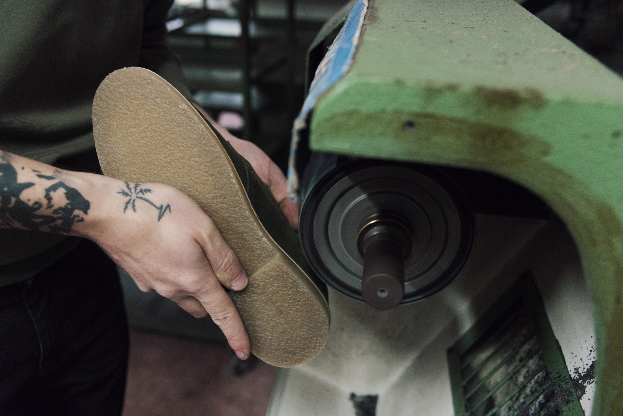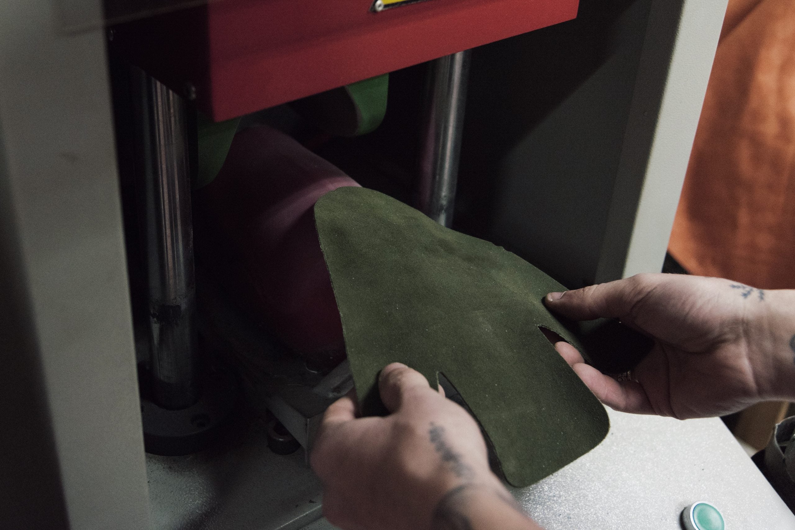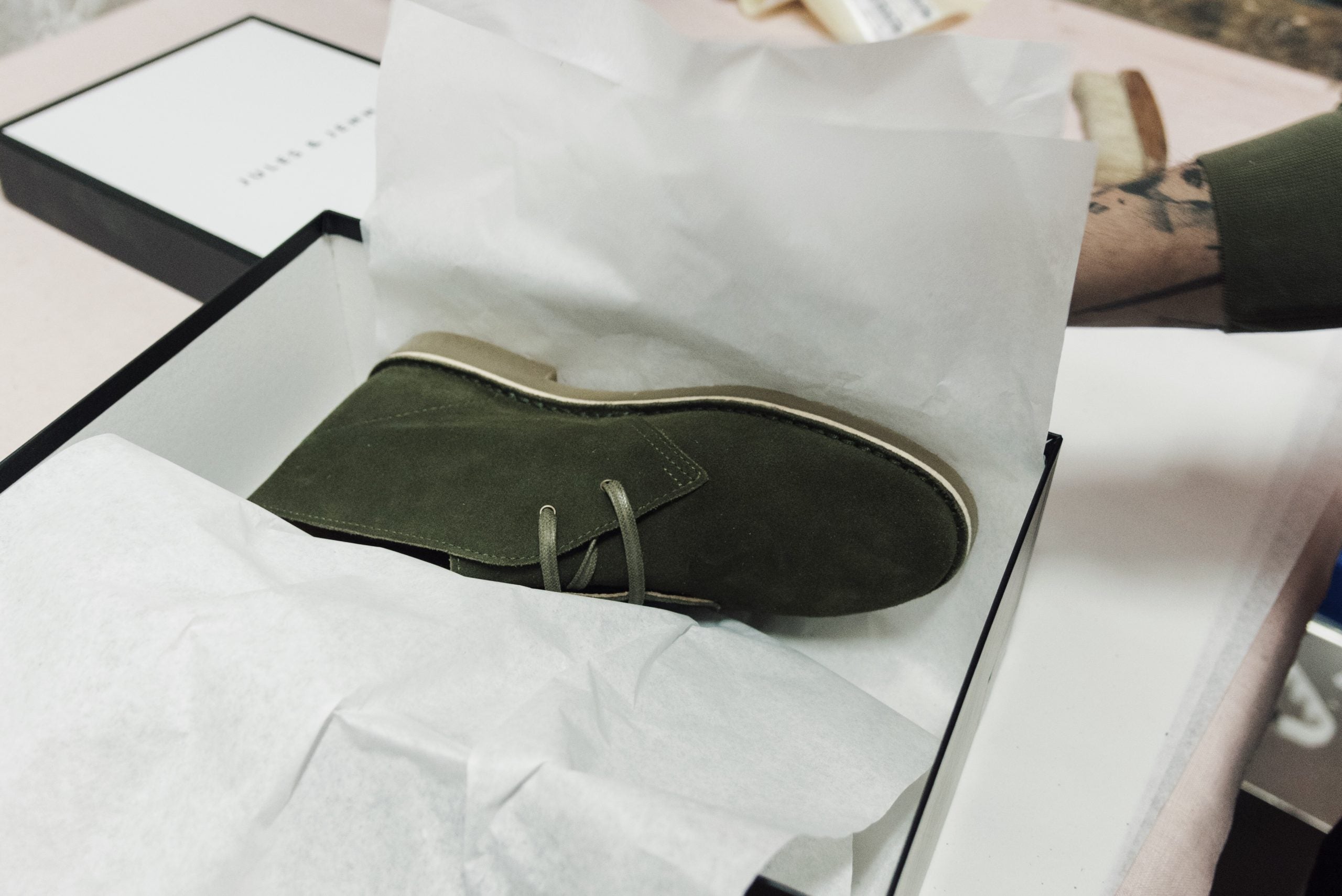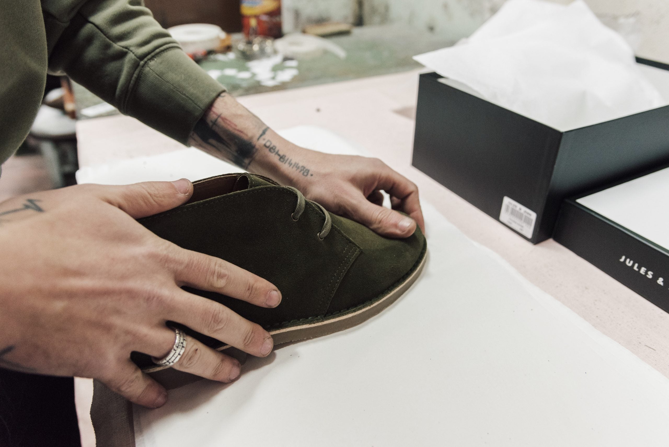 Sur la base du dessin, le modéliste réalise le patronnage des différentes parties qui vont composer la chaussure. Grâce à des emporte-pièces, le coupeur découpe, manuellement ou à l’aide d’une presse, les différentes parties du modèle dans la matière choisie. Les pièces doivent être soigneusement coupées pour éviter les défauts naturels du cuir. Les pièces composant la tige – le dessus de la chaussure – sont ensuite cousues entre elles. Les renforts et contreforts intérieurs sont cousus ou collés. La tige est ensuite posée sur un moule, variant selon la pointure, afin d’être fixée à la semelle interne. Selon le modèle, les opérations de couture, collage, ponçage et séchage se succèdent. Enfin, la semelle extérieure en cuir est fixée, par collage d’abord, parfois par couture. Après un temps de séchage, le montage de la chaussure est terminé. Le moule est alors retiré de la chaussure. La touche finale est la fixation de la première de propreté, qui est la semelle intérieure apparente, sur laquelle repose le pied. Enfin, la chaussure est bichonnée afin d’assurer une finition impeccable. Enrobée de papier de soie, la chaussure est délicatement posée dans sa boîte JULES & JENN. Il ne reste plus qu’à y glisser vos pieds.