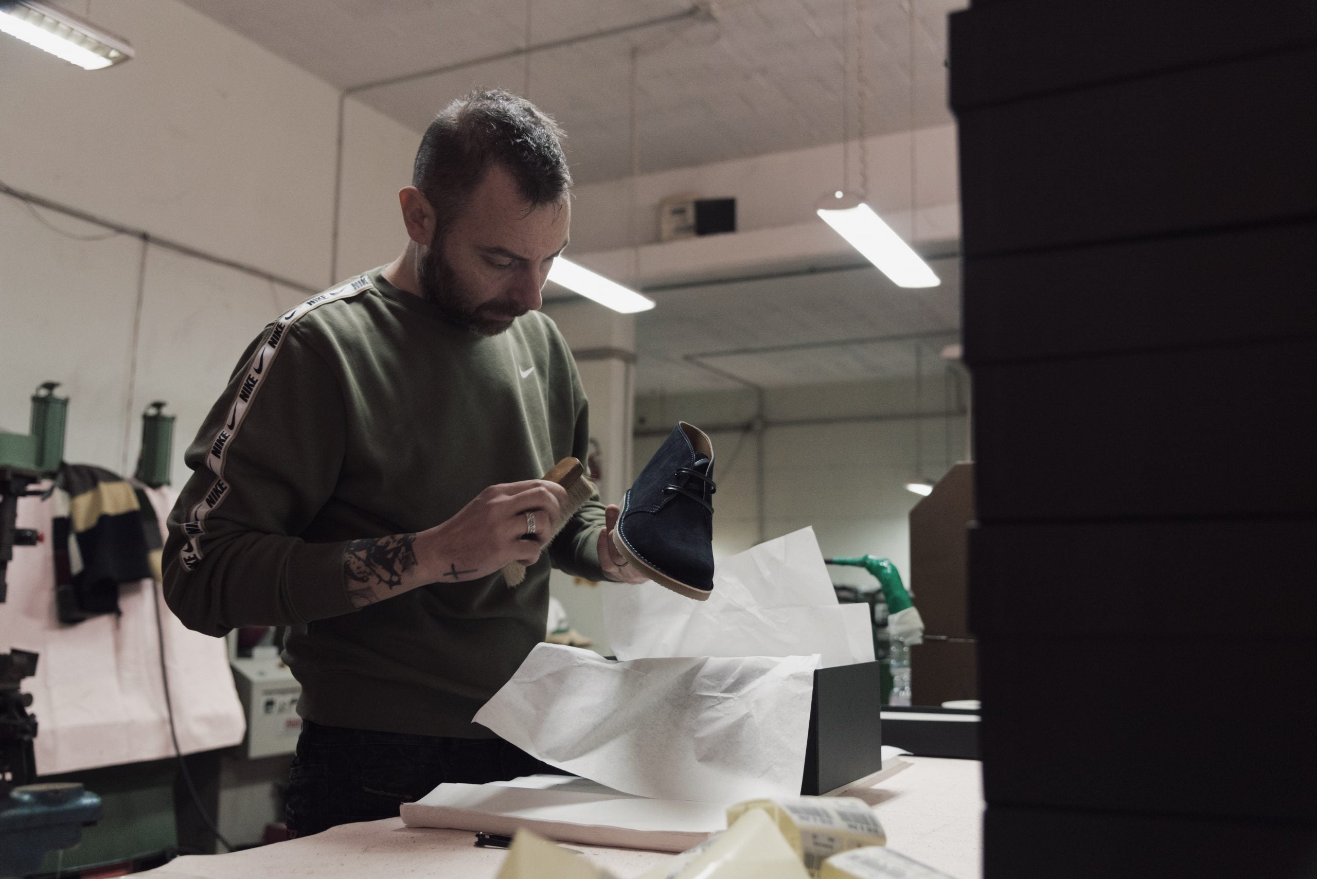 L’histoire de cet atelier de chaussures débute lorsque le grand-père des gérants actuels crée un centre de vente en gros qui recueille l’excellence et le savoir-faire des petits laboratoires de Campanie. À cette époque, la position géographique favorable, au centre de la Méditerranée et sur la route du canal de Suez et la douceur du climat font de Naples la destination idéale pour les investisseurs étrangers, en particulier en Europe du Nord. L’atelier a donc percé sur le marché mondial en créant des partenariats durables dans le nord de l’Italie et en Europe. La qualité des produits provient de la forte composante manuelle qui caractérise toutes les étapes de la chaîne de fabrication : chaque produit est réalisé à la main, avec des techniques artisanales haut de gamme, pour devenir, après de nombreuses étapes et contrôles, un objet exclusif. L’atelier poursuit cette mission de manière éthique et responsable, et dans le respect de l’environnement. Ce gage de qualité, mêlé à une réelle conscience des problématiques écologiques actuelles nous ont tout particulièrement donné envie de collaborer.